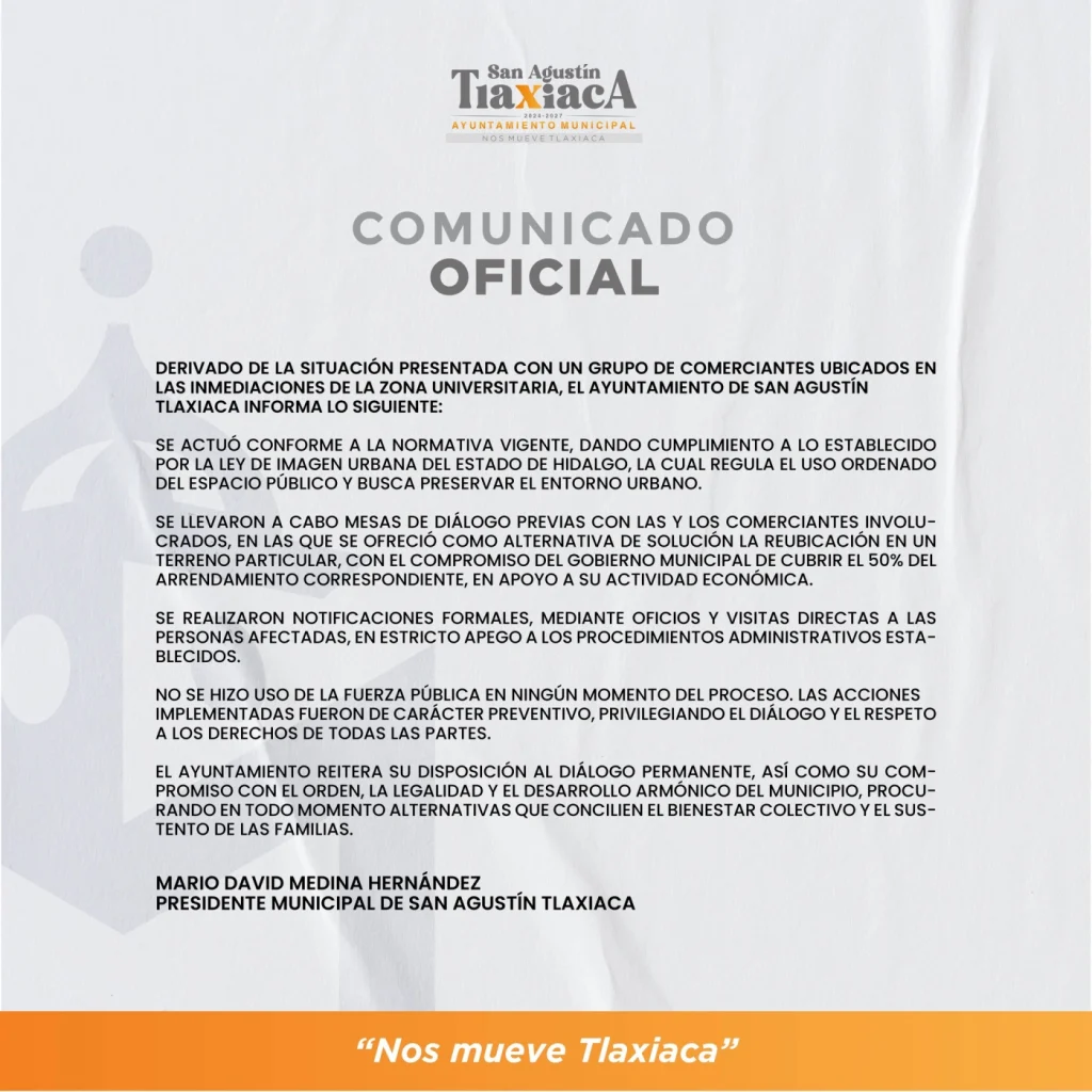 En contraste, el Ayuntamiento emitió un comunicado donde niega el uso de la fuerza y asegura que todo se llevó a cabo “en estricto apego a la Ley de Imagen Urbana del Estado de Hidalgo”.
