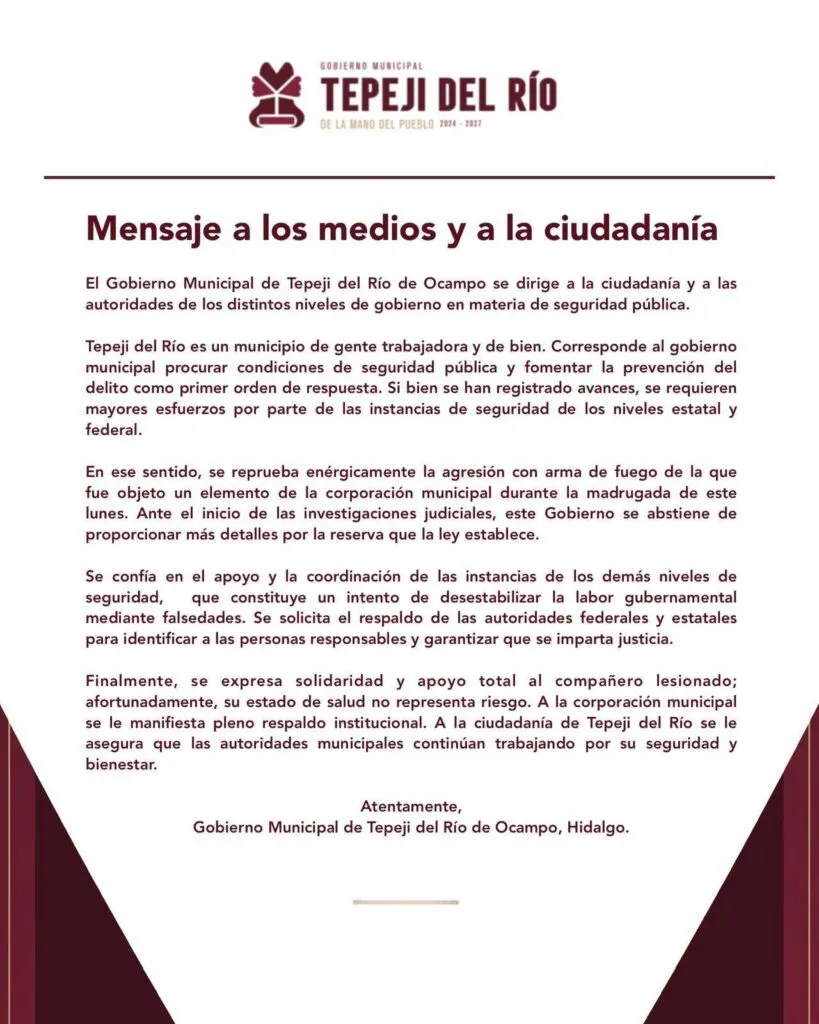 El Gobierno Municipal de Tepeji del Río emitió un comunicado en el que condenó la agresión y reafirmó su respaldo al cuerpo policiaco. También solicitó apoyo de autoridades estatales y federales para esclarecer los hechos.
