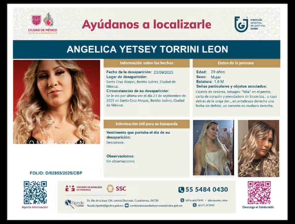 La Fiscalía de la Ciudad de México emitió un cartel de búsqueda para localizar a Angelica Yetsey Torrini León, conocida como Angie Miller, quien fue vista por última vez el 23 de septiembre en la colonia Santa Cruz Atoyac, alcaldía Benito Juárez. La ficha oficial refiere una cicatriz de cesárea y varios tatuajes distintivos.