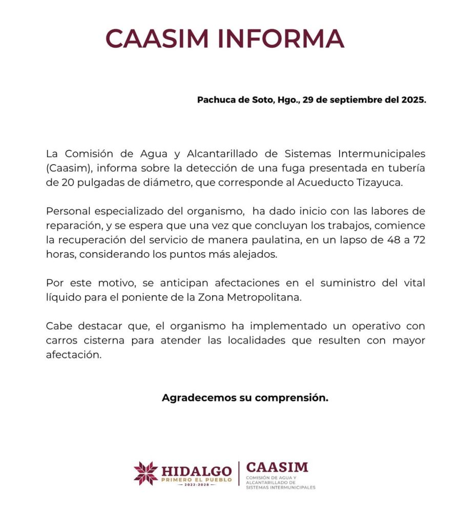 La Caasim informó que el restablecimiento del servicio será gradual, conforme avance el llenado de los tanques principales y la red de distribución. Se estima que la normalización total ocurra en un lapso de 72 horas.