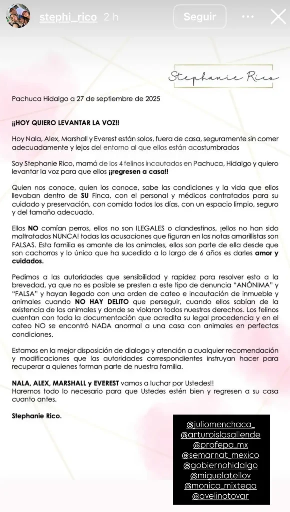 «Profepa (Procuraduría Federal de Protección al Ambiente) necesita revisar la papelería correspondiente para ver si los felinos se encuentran bien instalados; el caso ya no es un tema de la Procuraduría (de Justicia), ya es un tema de Profepa», dijo Fernández Hasbún.
