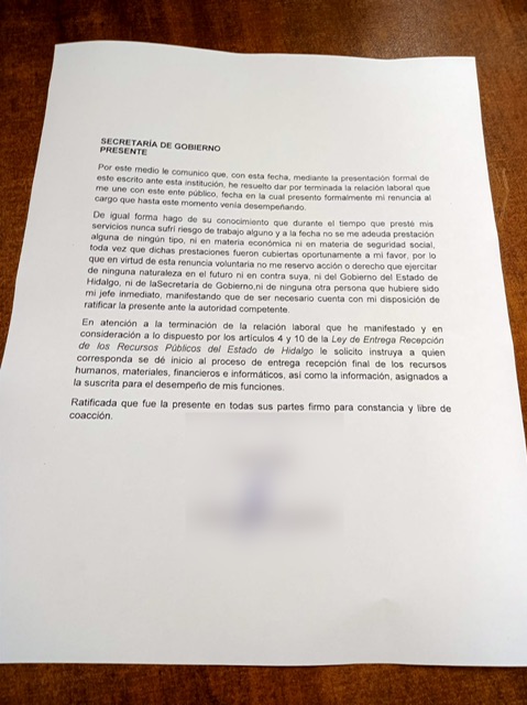 Varios afectados confirmaron a este medio que el escrito es entregado directamente por superiores y contiene lenguaje legal, en apariencia voluntario, en el que el trabajador declara renunciar a su puesto, afirma no tener reclamos futuros contra el gobierno estatal y solicita la entrega-recepción de su cargo.